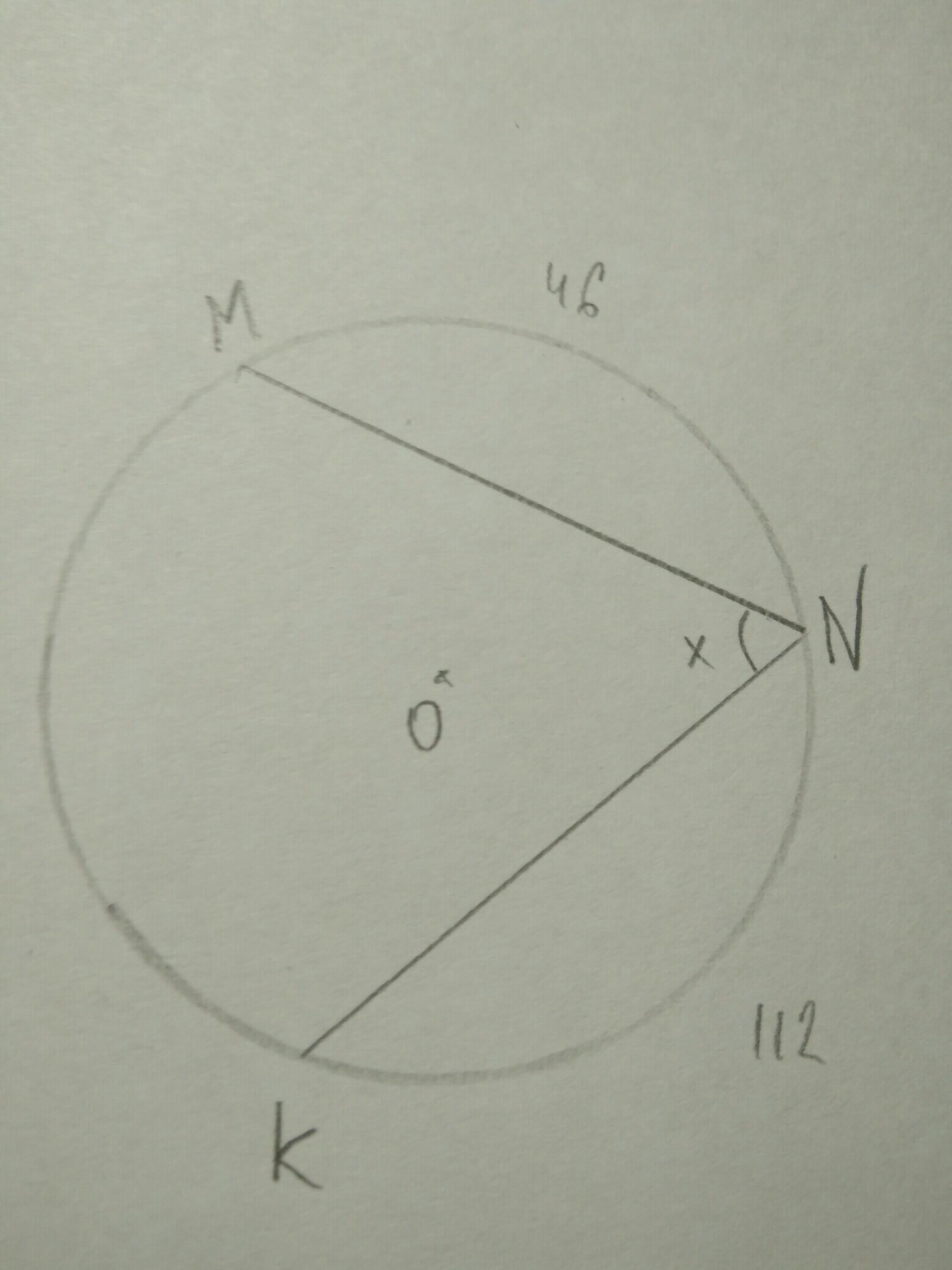 Дуга MK= 360-(46+112)=202 градуса Угол MNK - вписанный и равен 1/2дуги MK, тогда угол MNK =202/2=101 x=101 градус