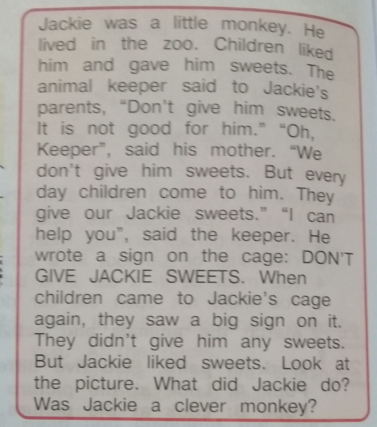 Джеки была маленькой обезьянкой. Онжил в зоопарке. Детям понравилосьему и дали ему сладости. Тотживотное! хранитель сказал Джекиродители, не давайте ему сладостей.Это не очень хорошо для него. -оХранитель, сказала его мать. Мыне давайте ему сладостей. Но каждыйдень дети приходят к нему. Ониотдай наши сладости Джеки. мочьпомогите, сказал владетель. Оннаписал табличку на клетке: не надоДАЙ ДЖЕКИ СВИТС. Когдадети пришли в клетку Джекиопять же, они увидели на нем большой знак.Они не дали ему никаких сладостей.Но Джеки любила сладости. Рассматриватькартина. Что Джеки сделала?Джеки была умной обезьянкой?