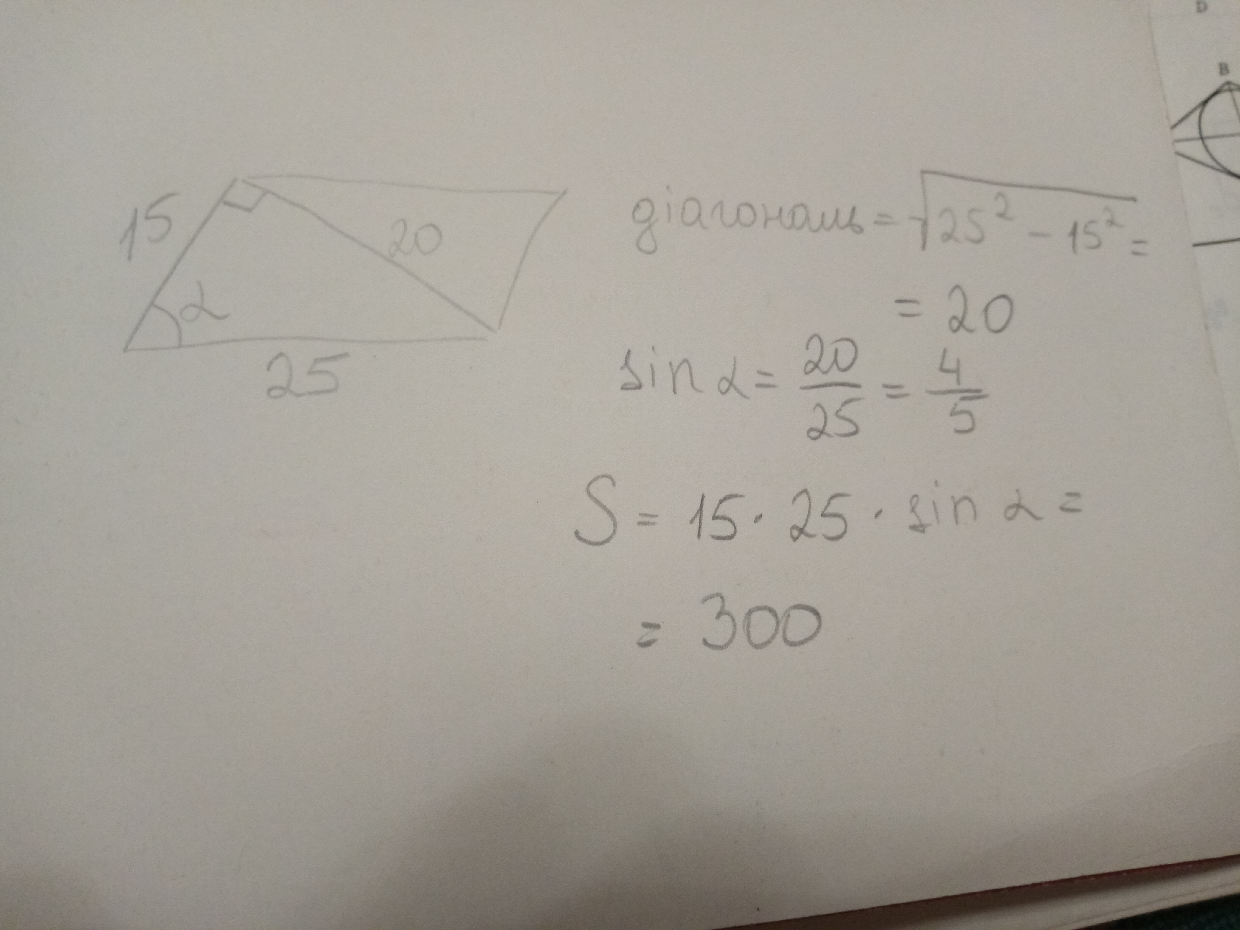 Знайдіть площу паралелограма,сторони якого дорівнюють 15 см і 25 см,а одна з діагоналей перпендикулярна до меншої сторони.ПОМОГИТЕЕЕ