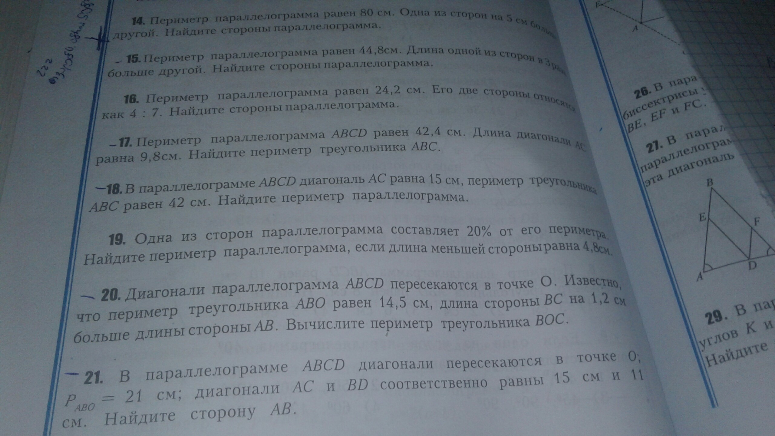 20) Т.к. диагонали точка пересечения делит пополам, то AO=CO, BO=OD. Пусть AB=x, тогда BC=X+1,2, а значит P=14,5-x+x+1,2=15,7.