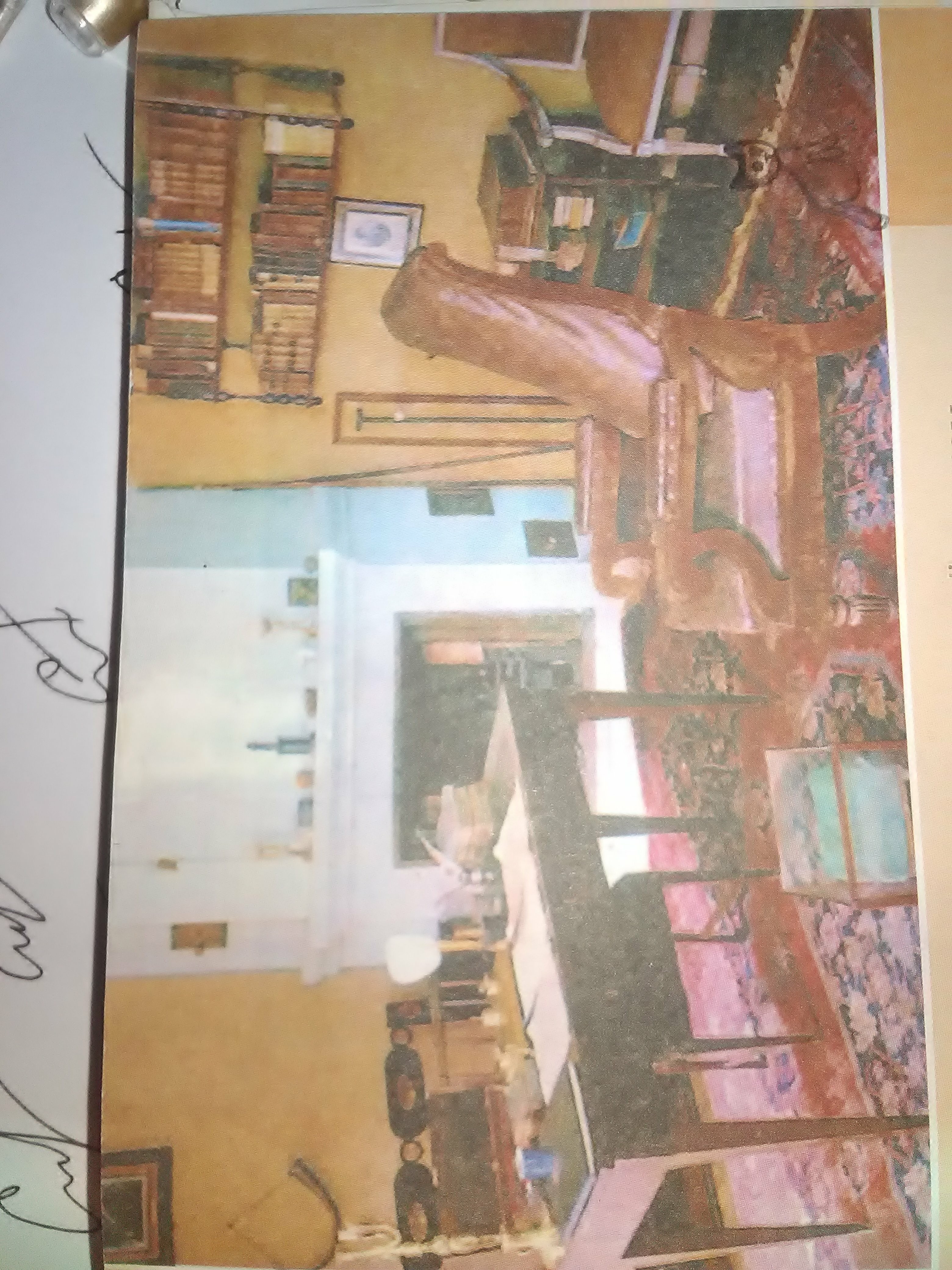 Справа находится полка с книгами, возможно любимыми произведениями великого поэта. На стене висят несколько фотографий близких Пушкину людей.