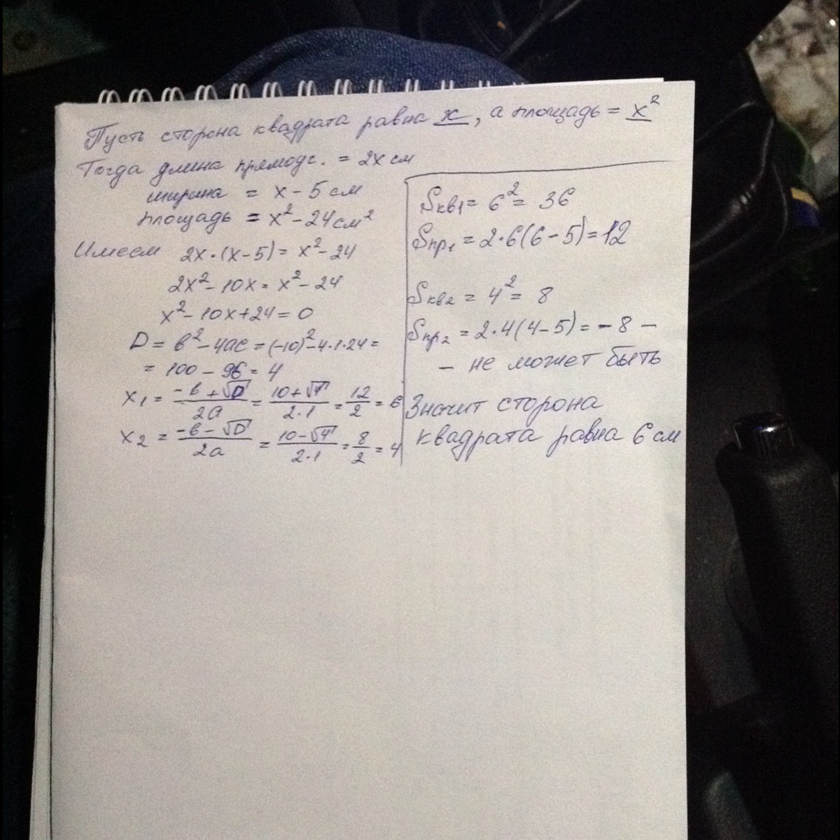 Длина прямоугольника в 2 раза больше, а ширина- на 5 см меньше стороны квадрата. Найдите сторону квадрата, если его площадь на 24 см² больше площади прямоугольника.