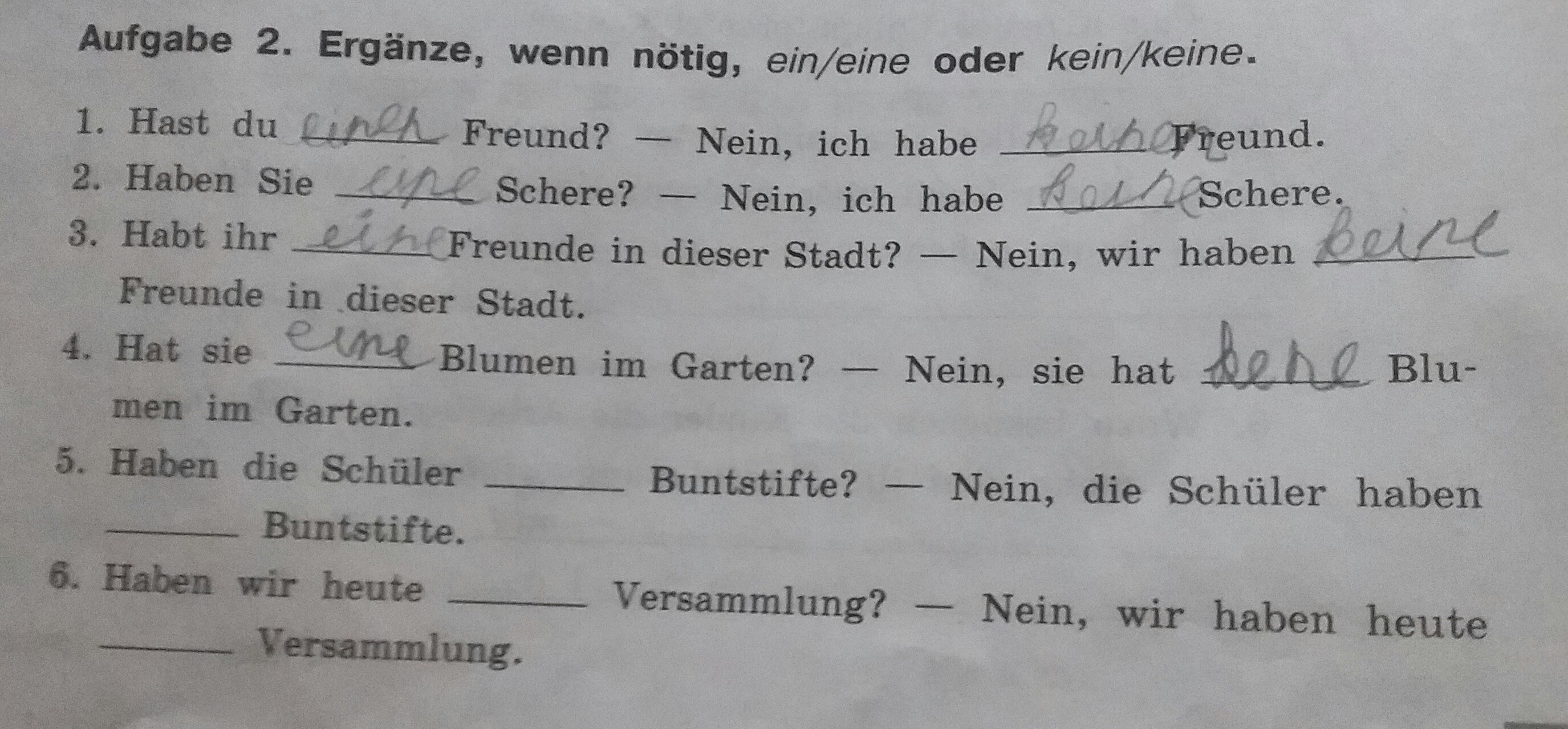 5) Haben die Schuler Buntstifte? - Nein, die Schuler haben keine Buntstifte.