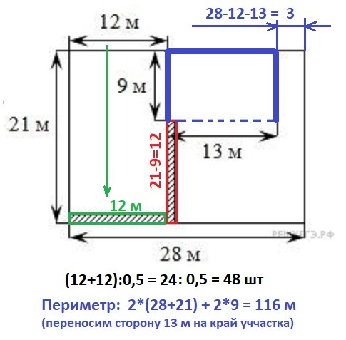 Упрощаем расчет периметра - перенесем внутреннюю сторону 13 м на край участка и к периметру прямоугольника 28*21 остается добавить два внутренних участка по 9 м.