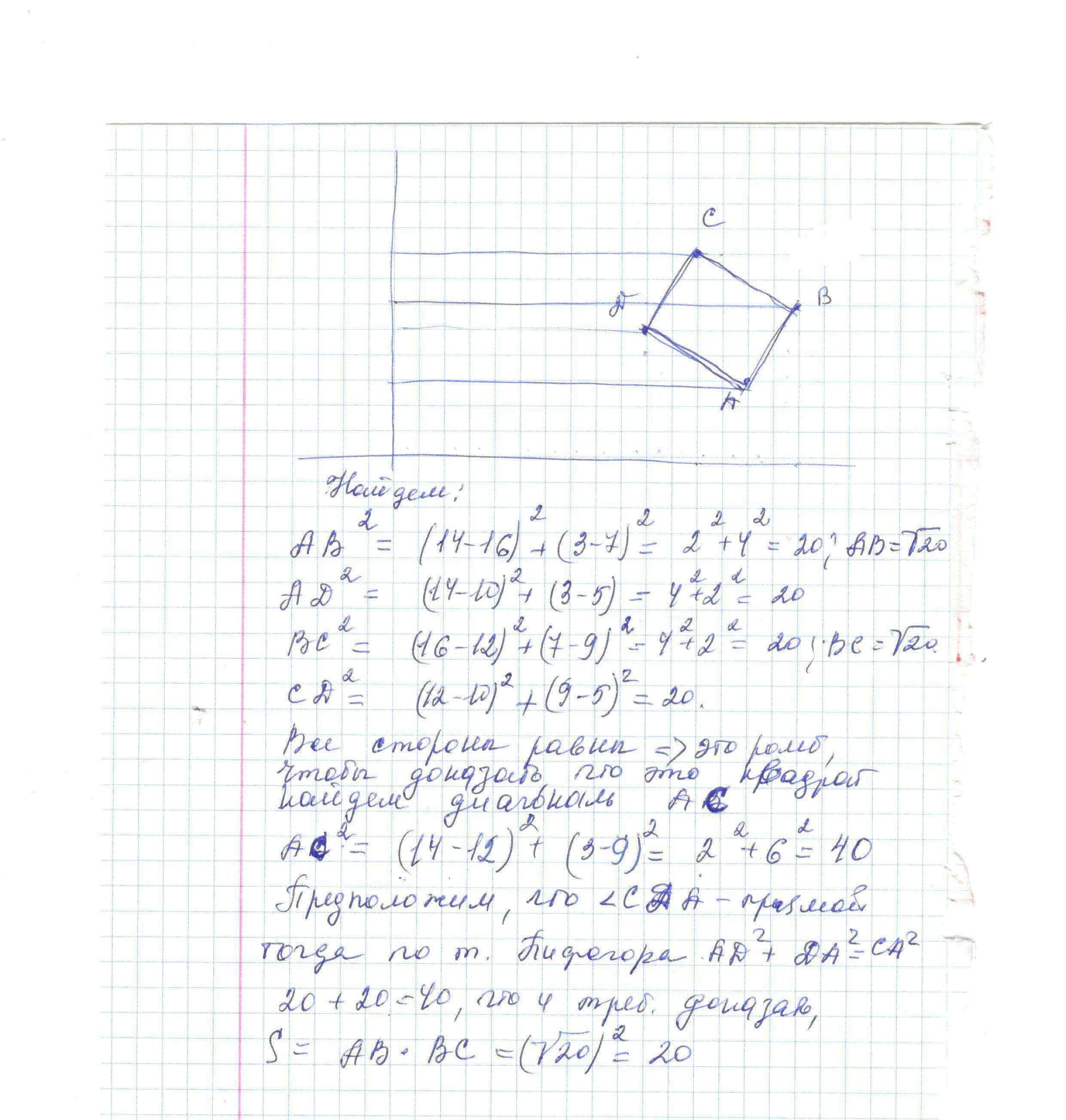 Докажи, что четырёхугольник ABCD является прямоугольником, найди его площадь, если A(14;3), B(16;7), C(12;9) и D(10;5) .
