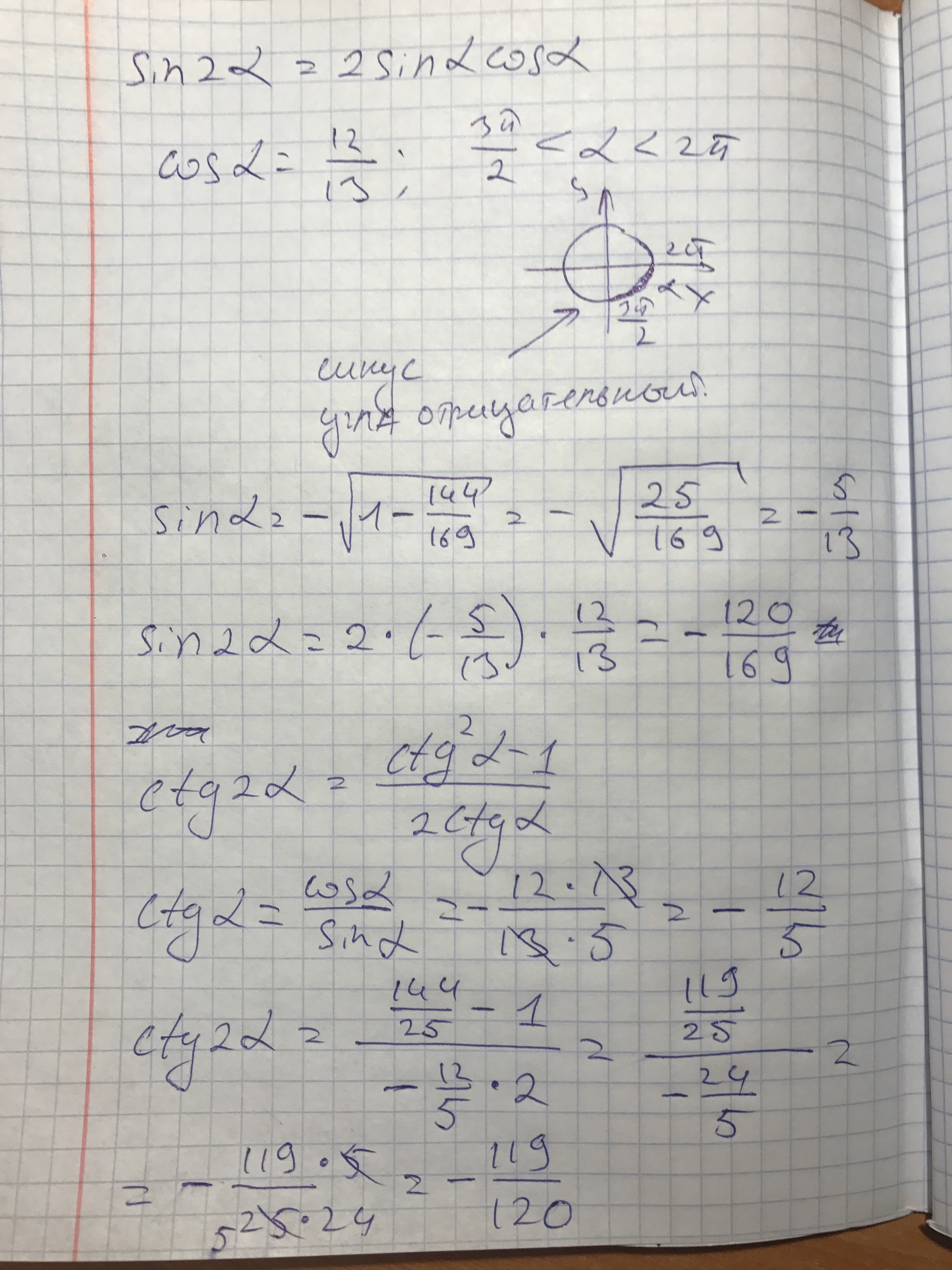вычислить sin(2а) и ctg(2а) , если cos = 12/13 , а 3п/2 < а < 2п