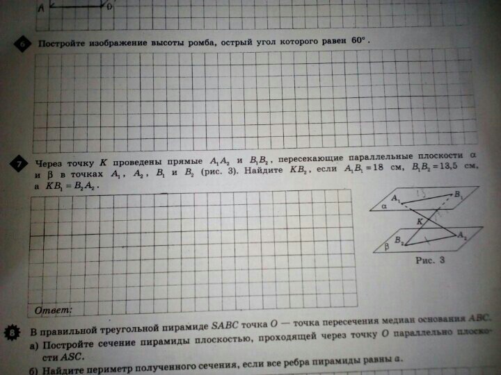 Через точку K проведены прямые A1A2 и B1B2, пересекающие параллельные плоскости a и b в точках A1, A2, B1, B2. Найдите KB2, если A1B1=18см, B1B2=13,5 см, а KB1=B2A2