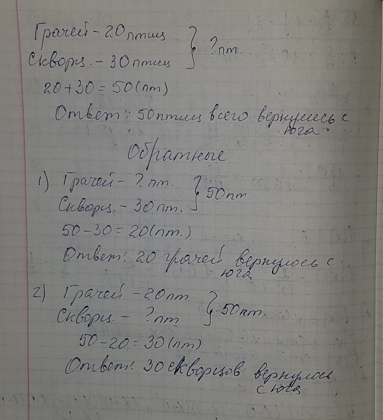 прочитай задачу Начерти схему и реши её.Составь к данной задаче 2 обратные задачи.Реши их.Весной с юга прилетели 20грачей и 30скворцов.Сколько всего прилетных птиц вернулось с юга