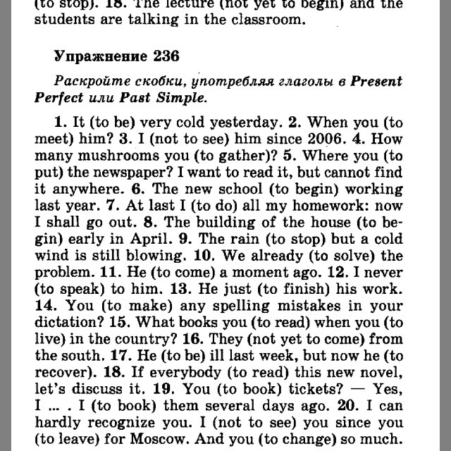 14. Did you (make) any spelling mistakes in your dictation? (оба возможны) 15. What books did you ( read) when you ( lived) in the country? 16. They ( have not yet come) from the south. 17. He (was) ill last week. but now he (has recovered). 18. If everybody (has read) this new novel. let's discuss it. 19. Have you ( booked) tickets? - Yes, I have. I (booked) them several days ago. 20. I can hardly recognize you. I have (not seen) you since you ( left) for Moscow. And you ( have changed) so much.