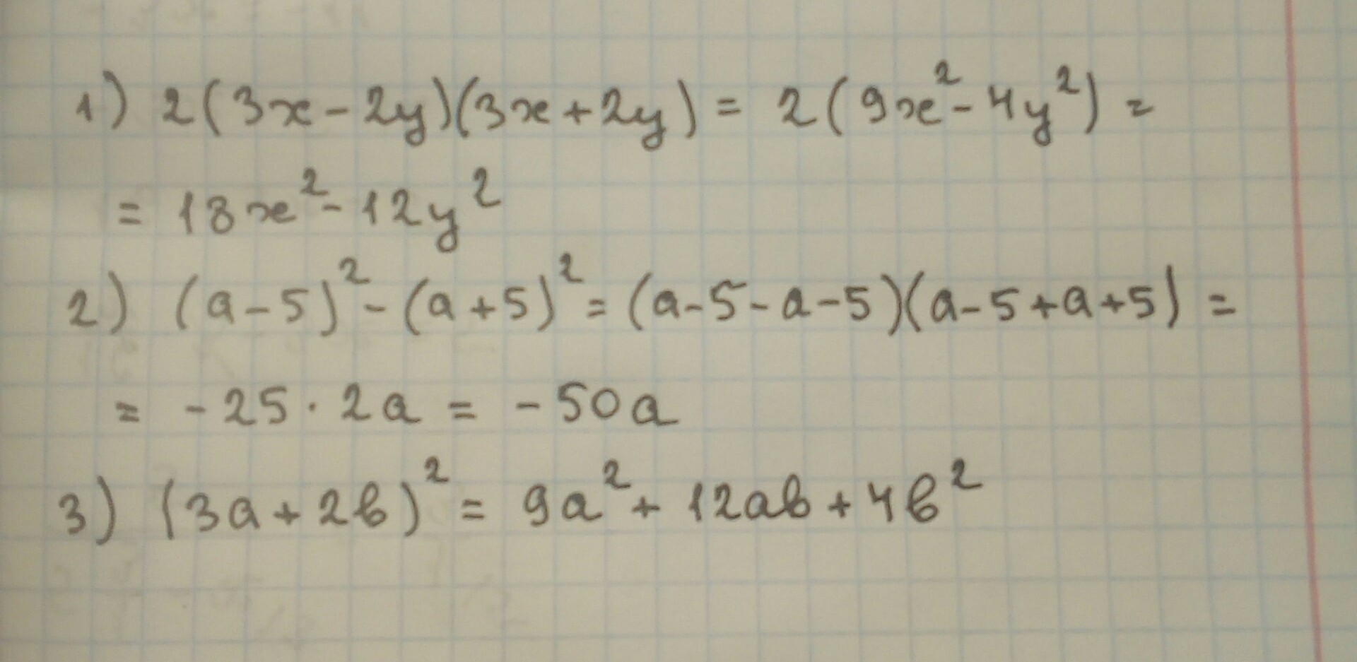 1) 2(3х – 2у)(3х + 2у); 2) (а – 5)² – (а + 5)² ; 3) ( 3а + 2b)².