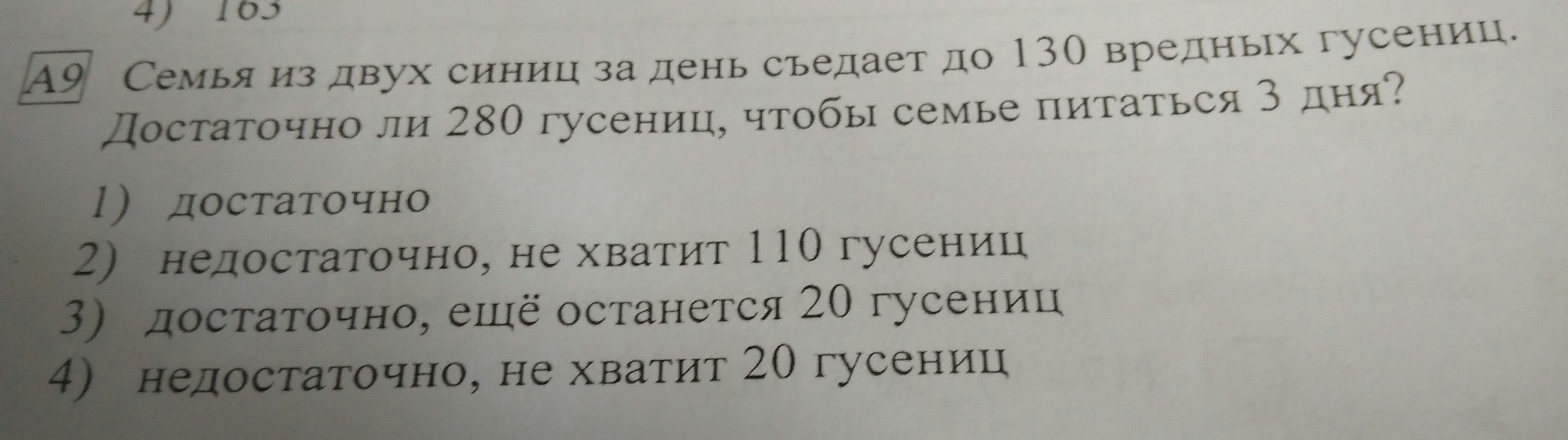семья из двух синиц за день съедает до 130 вредных гусениц достаточно ли 280 гусениц чтобы семье питаться 3 дня