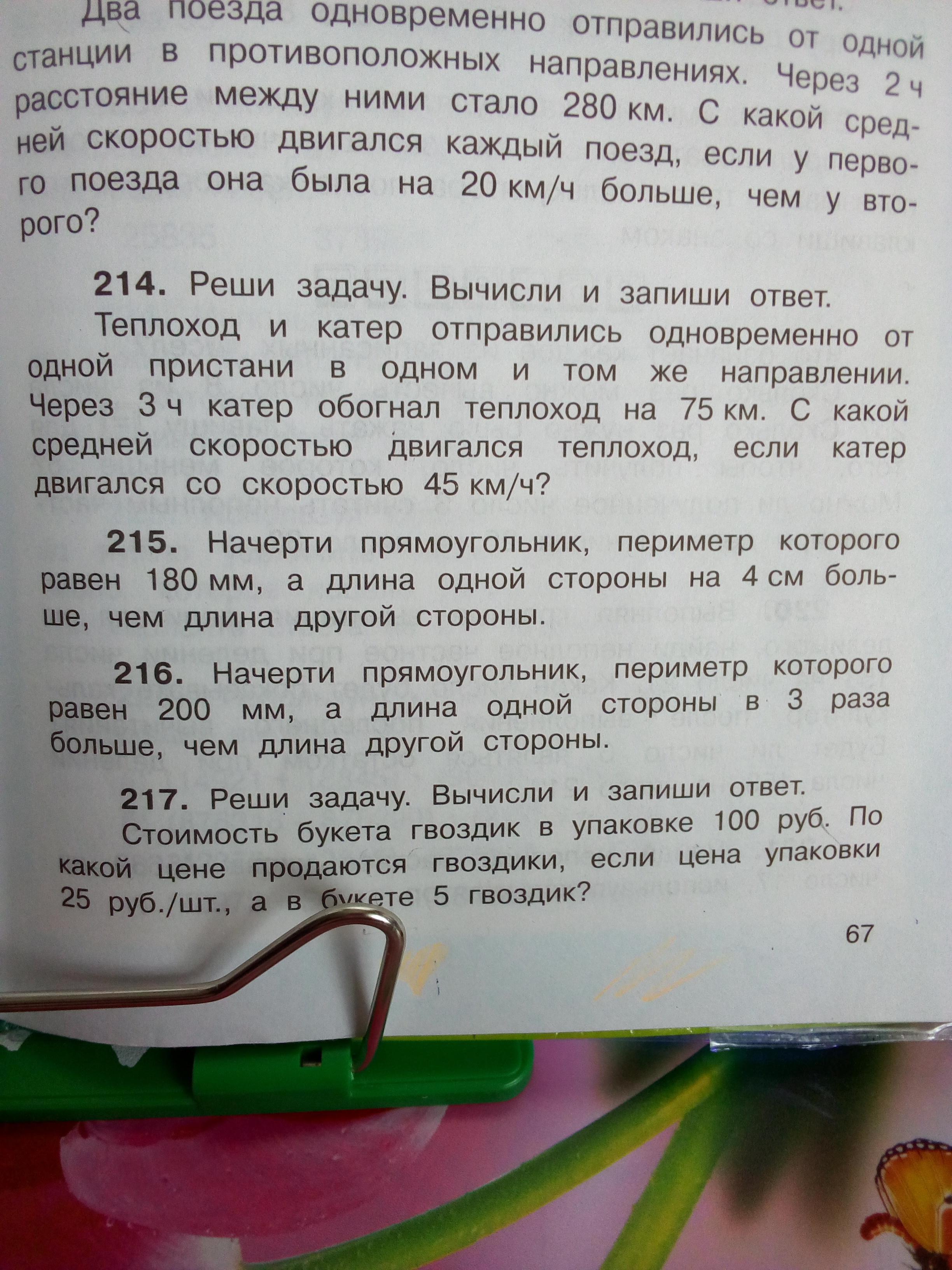 214. Так как за 3 часа катер обогнал теплоход на 75 км, то каждый час он обгонял его на 25 км. Значит, скорость катера на 25 км/ч больше, чем теплохода. Значит, скорость теплохода равна 45-25 = 20 км/ч
