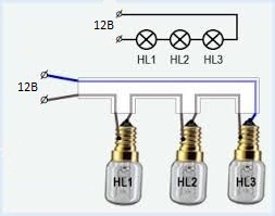 2. В автомобильной переноске сгорела лампочка. В багажнике оказалось несколько ламп от шахтерского фонаря по 4,5 В. Сколько таких ламп и как их нужно соединить для восстановления работоспособности переноски, если бортовое напряжение 12 В? Начертить электрическую схему.