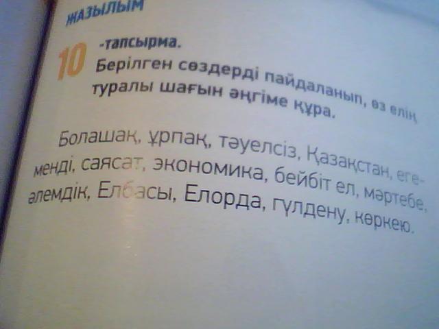 Біз отанымыздың болашақ ұрпағымыз.Қазақстан егеменді,тәуелсіз,бейбіт ел.Экономиканың,астананың гүлденіп шарықтауы Елбасы арқасы. Қазақстан көп ұлтты мемлекет.Қазақ жерін əрі қарай көркеюі біздің қолымызда!Мен елімді сүйемін!