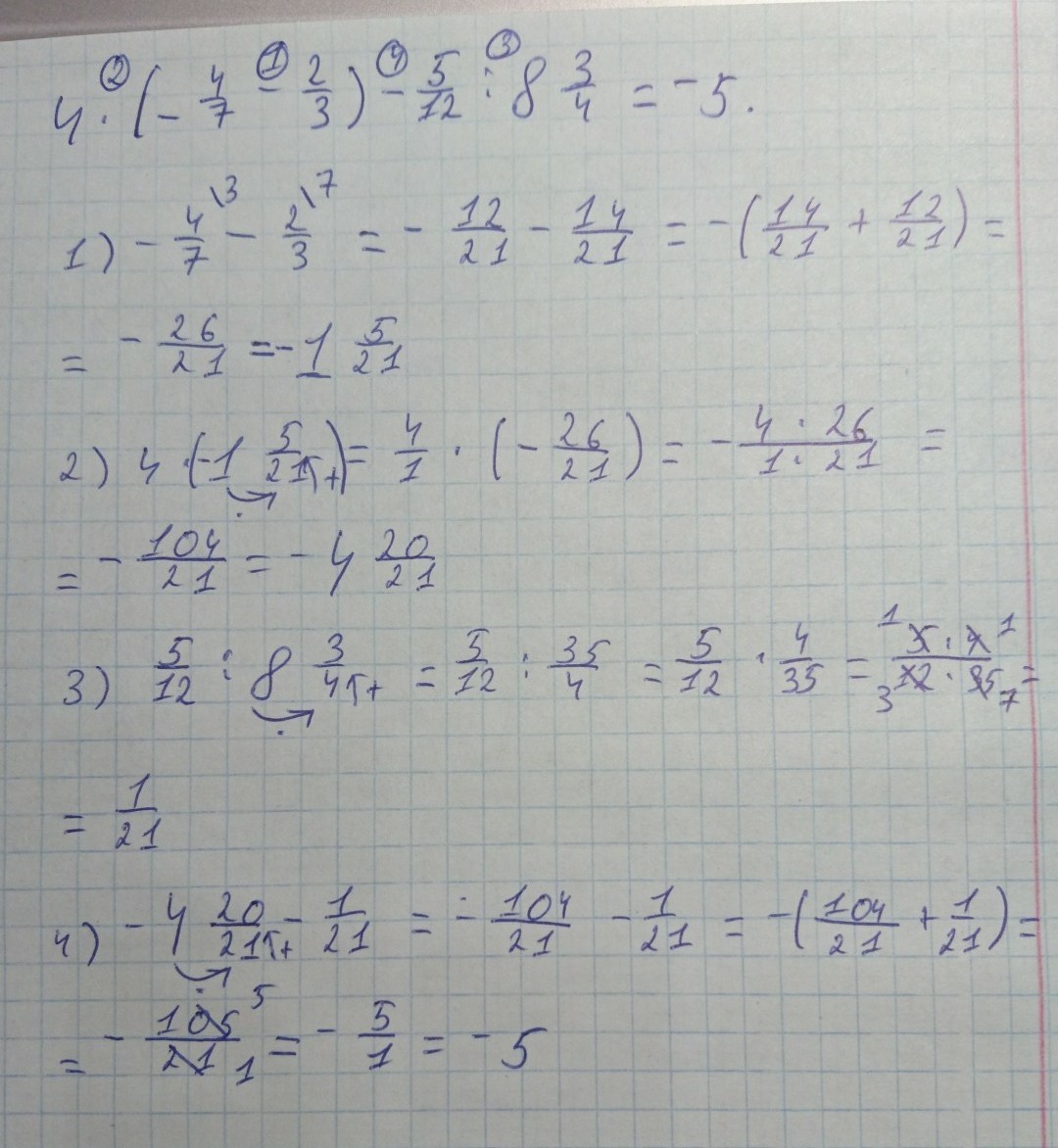 Помогите пожалуйста решить четыри умножить скобку открываем минус четыри седьмых минус две третьих скобку закрыли минус пять двенадцатых разделить на восемь целых три четвёртых по действиям спасибо
