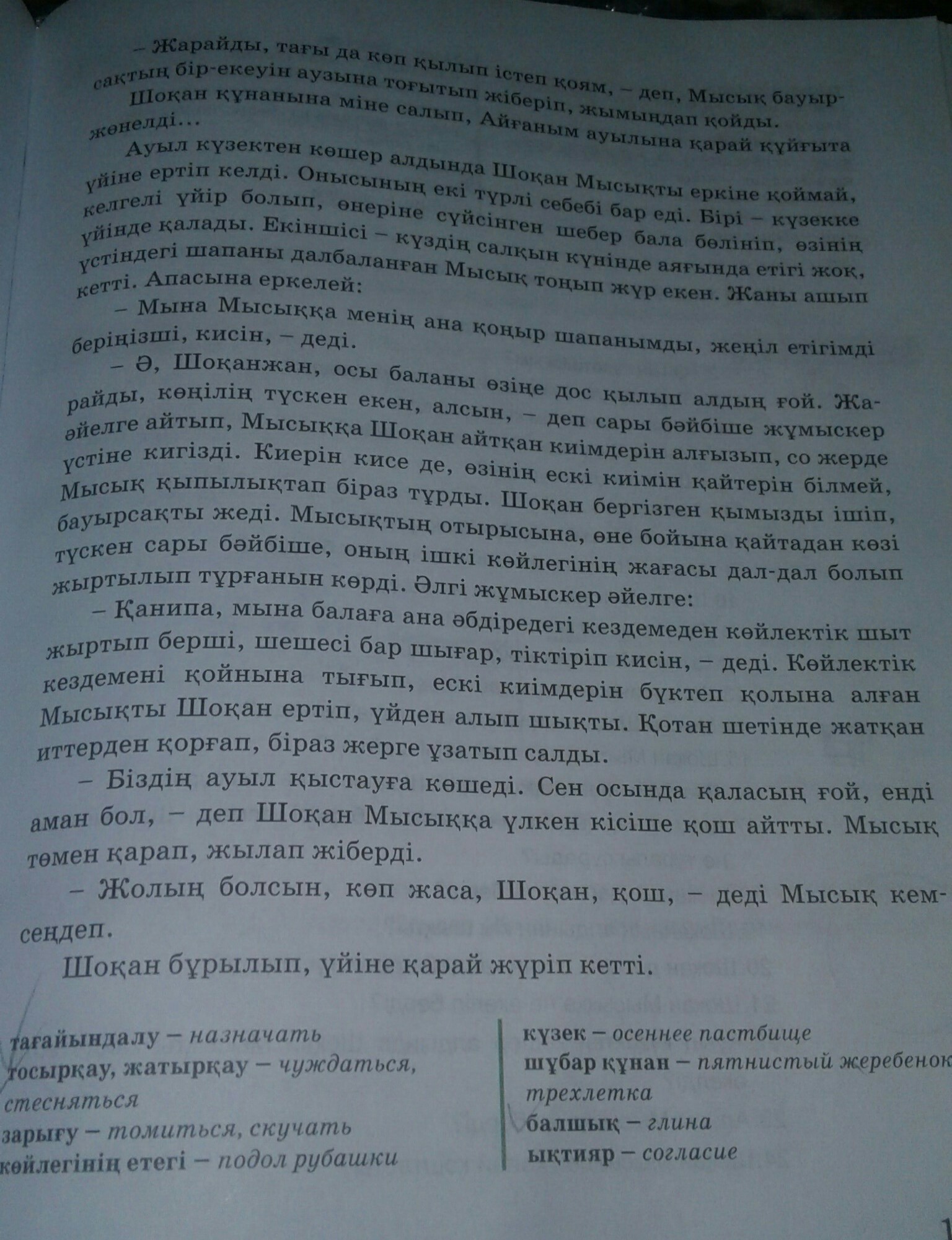 Там рассказывается о шокане валиханове. О его детстве. Однажды он пришел к мальчику родители которого работали у отца шокана. У мальчика были игрушки из войлока, которые он делал сам. Шокан попросил верблюжонка из войлока который ему очень понравился но мальчик а его звали мысык не хотел давать шокану игрушку, пото му что обманув его один мальчик украл его игрушки. Но шокан был не таким. Он сказал что даст мысыку баурсаки и сахар взамен на верблюжонка. Мальчик сказал что будет делать птицу. Через нескольео дней шокан пришел к мысыку за птичкой. Шокан и его семья должны были ехать на кыстау. Увидев что мысык в холодное время года ходит в старых порваных сапогах, шокан дал ему свои новые сапоги. Уезжая шокан пожелал всего хорошего мысыку, а мысык расплакался.