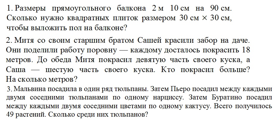 2)Размеры прямоугольного балкона 2м10см на 90 см.Сколько нужно квадратных плиток размером 30х30,чтобы выложить пол на балконе?3)Митя со своим братом красили забор на даче.Они поделили работу поровну.Каждому досталось покрасить 18 м .До обеда Митя покрасил девятую часть своего куска,а брат шестую часть своего куска.Кто покарсил больше ? На сколько метров?