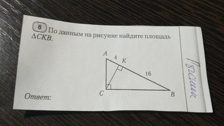 СК^2=AK*KB=4*16 => CK=8 S= 1/2AB*CK= 1/2(4+16)*8=80