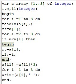 var a:array [1..3] of integer;i,m,i1:integer;beginfor i:=1 to 3 doreadln(a[i]);m:=a[1];for i:=2 to 3 doif m<a[i] thenbeginm:=a[i];i1:=i;end;a[i1]:=a[i1]*3;for i:=1 to 3 dowrite(a[i],' ');end.