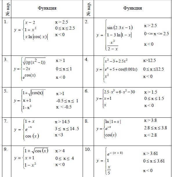 Разработать подпрограмму для вычисления значения функции (функция определена в таблице 1). Значение функции вычислять с точностью до тысячных долей.