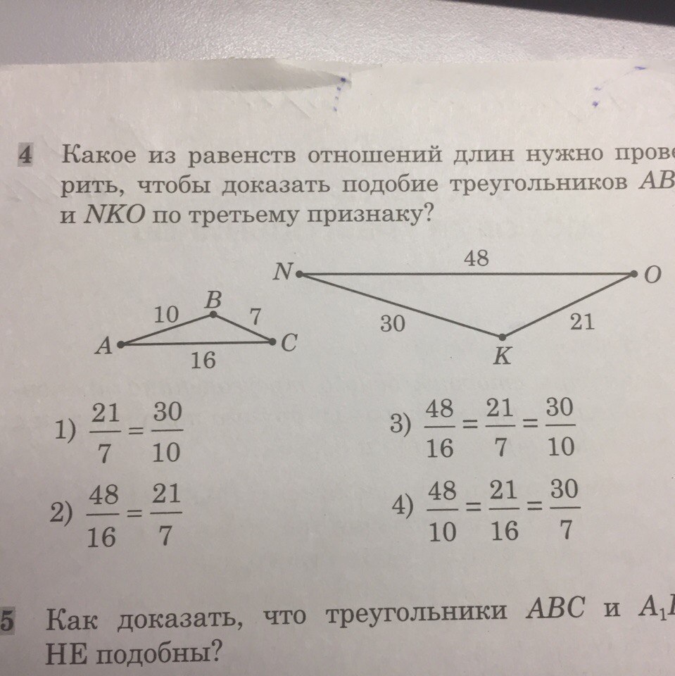 Какое из равенств отношений длин нужно проверить, чтобы доказать подобие треугольников ABC и NKO по третьему признаку?