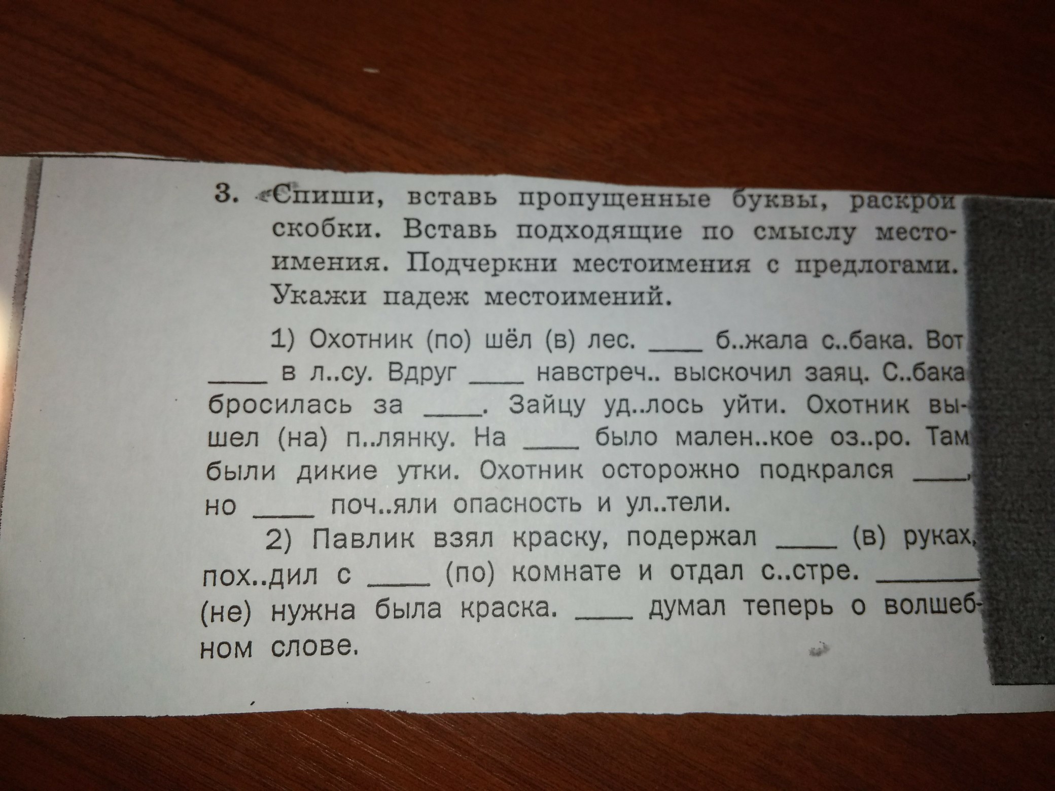 Охотник пошел в лес, !за ним(Тв.п) бежала собака. Вот он (Им. п) в лесу. Вдруг ему (Дат. п) навстречу выскочил заяц. Собака бросилась !за ним (Пр.п). Зайцу удалось уйти.Охотник вышел на полянку.!На ней (Пр.п) было маленькое озеро.Там были дикие утки.Охотник осторожно подкрался !к ним. (Дат.п), но они (Им.п) почуяли опасность и улетели.