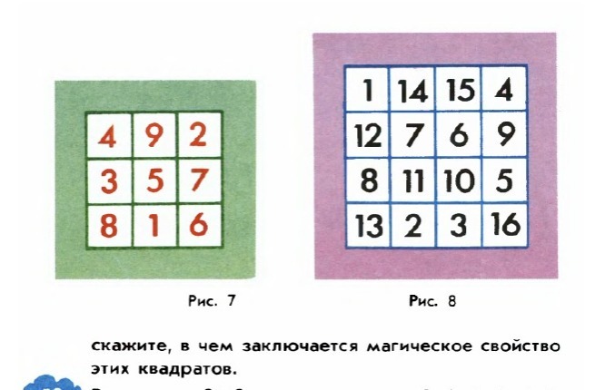 В том, что на рисунке 7 сумма всех чисел в столбце, строке и диагонали равна 15. Во втором квадрате - аналогично, но сумма равна уже 34