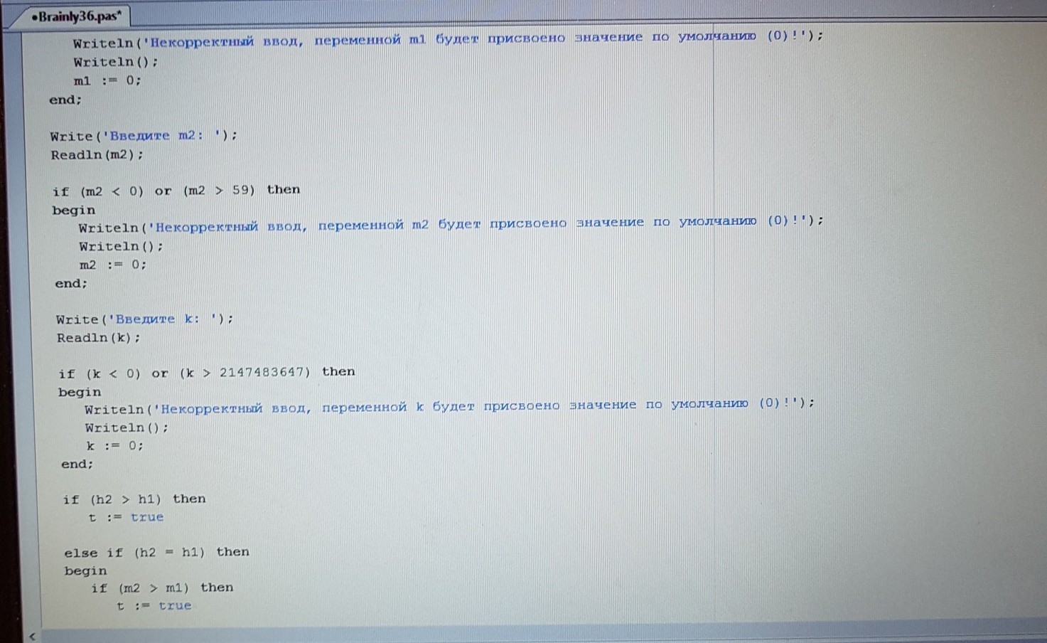 Writeln('Некорректный ввод, переменной m1 будет присвоено значение по умолчанию (0)!');