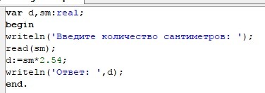 var d,sm:real;beginwriteln('Введите количество сантиметров: ');read(sm);d:=sm*2.54;writeln('Ответ: ',d);end.