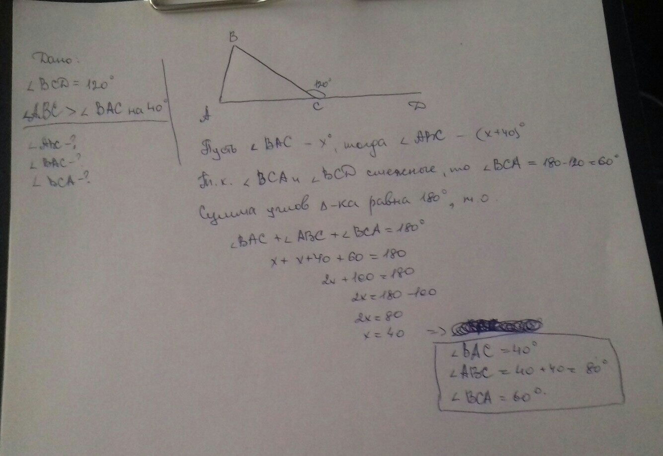 внешний угол треугольника равен 120°, а два внутренних, не смежных с ним такие, что один из них на 40° больше другого. найти все углы