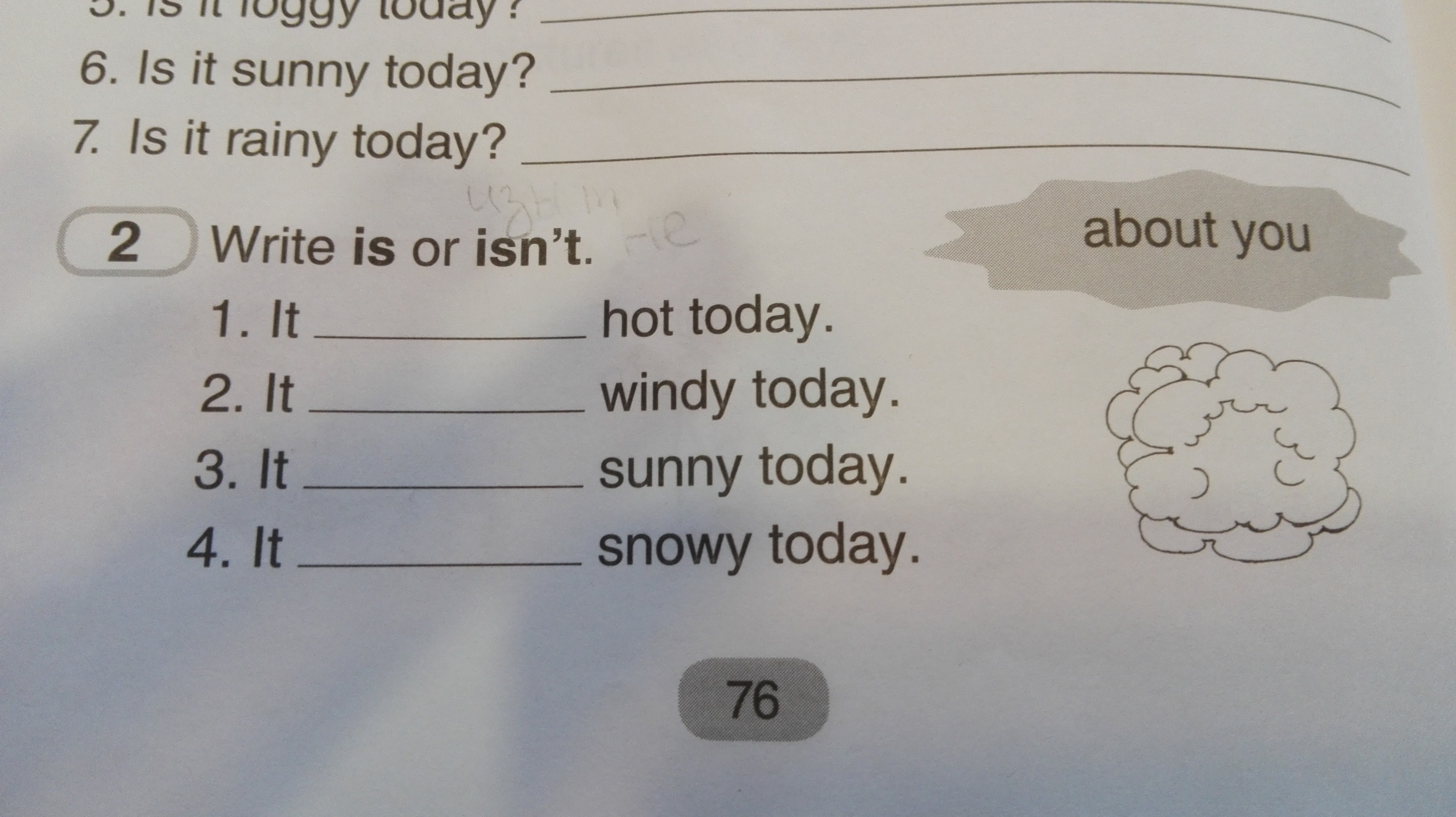 В этом задании нужно описать погоду за окном. То есть, в любом пропуске можно поставить is или isn't, в зависимости от того, что Вы хотите сказать, какая у Вас сегодня погода. Например, первое предложение "Сегодня ___ жарко". Если поставить is, то будет "Сегодня жарко", если isn't, то "Сегодня НЕ жарко". Второе предложение "Сегодня ____ ветрено". Если поставить is, то "Сегодня ветрено", если isn't, то нет, сегодня ветра нет. И так далее.