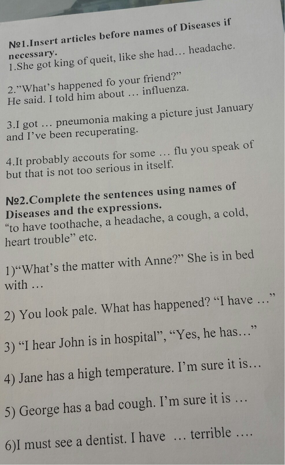 1. a headache 2. heart trouble 3. cancer 4. pneumonia 5. tuberculosis 6. a terrible toothache