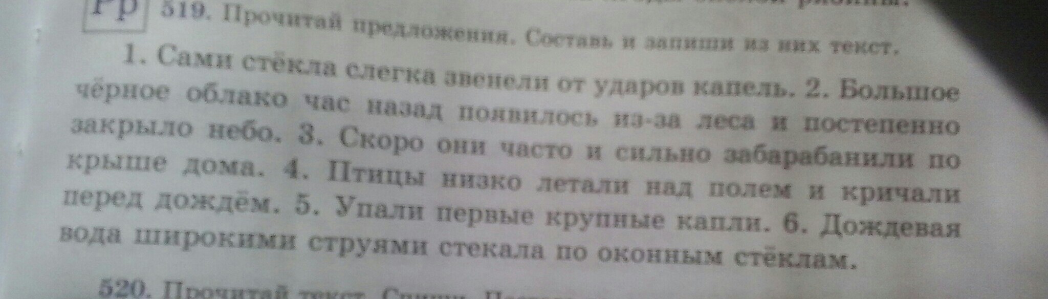 Птицы низко летали над полем и кричали перед дождём. Большое чёрное облако час назад появилось из-за леса и постепенно закрыло небо. Упали первые крупные капли. Скоро они часто и сильно забарабанили по крыше дома. Дождевая вода широкими струями стекала по оконным стёклам. Сами стёкла слегка звенели от ударов капель.