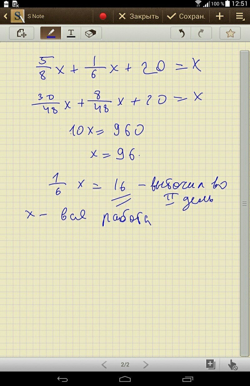 В первый день токарь сделал 5/8 всей работы во второй день 1/6 всей работы, а в третий выточил оставшиеся 20 деталей. Сколько деталей выточил рабочий во второй день?