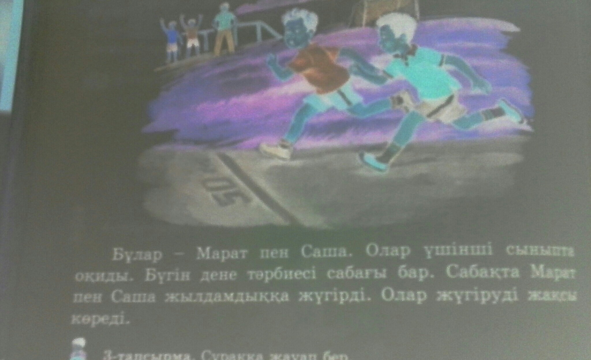 Тебе это перевести надо.Ну ок:Это Марат и Саша.Они учатся в третьем классе.Сегодня у них урок физ-ры.На уроке Марат и Саша бежали (бегали) на скорость.Они любят бегать.