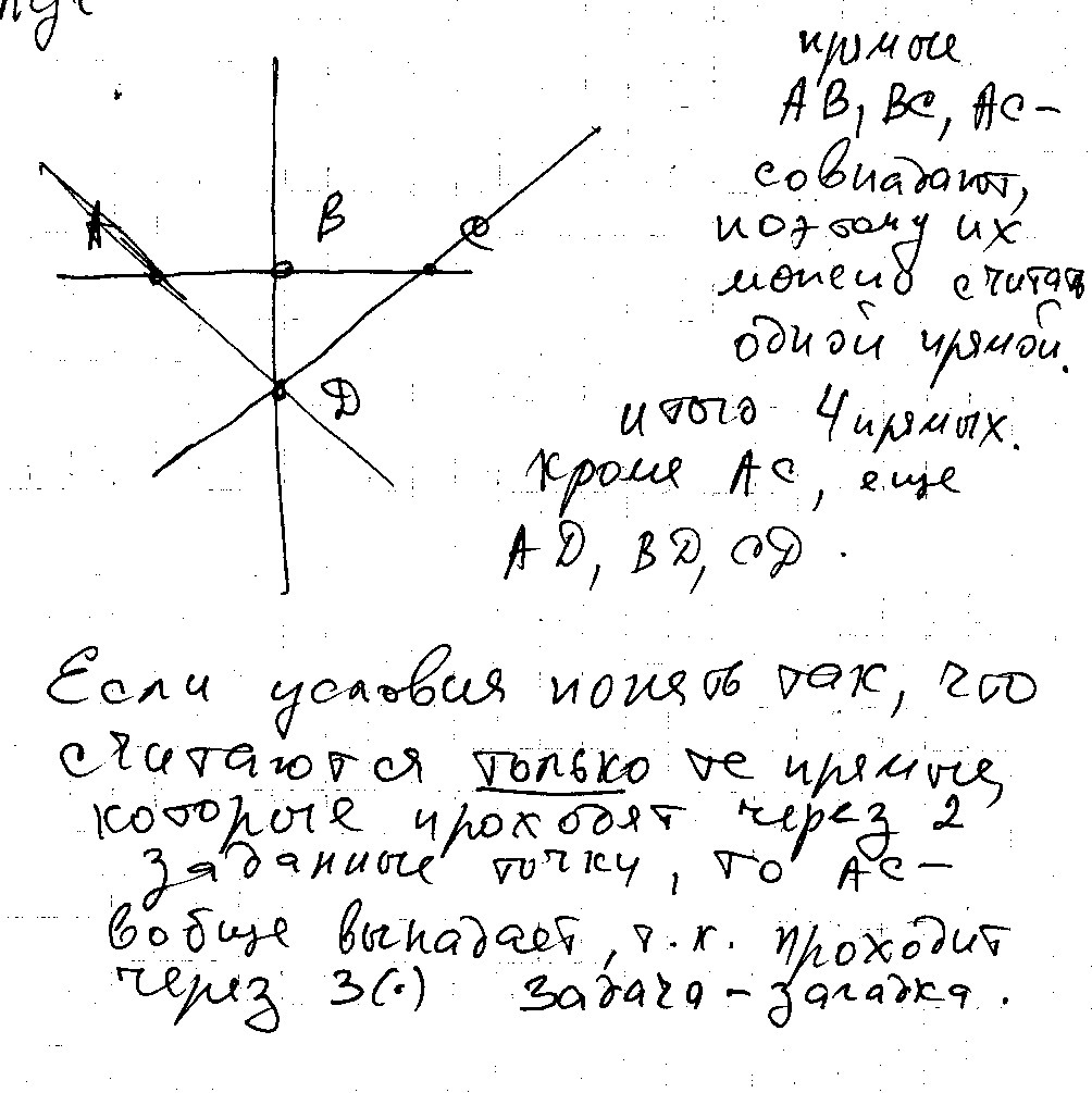 Отметьте точки А,В,С,D так,чтобы точки А,В,С лежали на одной прямой,а D не лежала на ней.Через каждые две точки проведите прямую.Сколько получилось прямых??