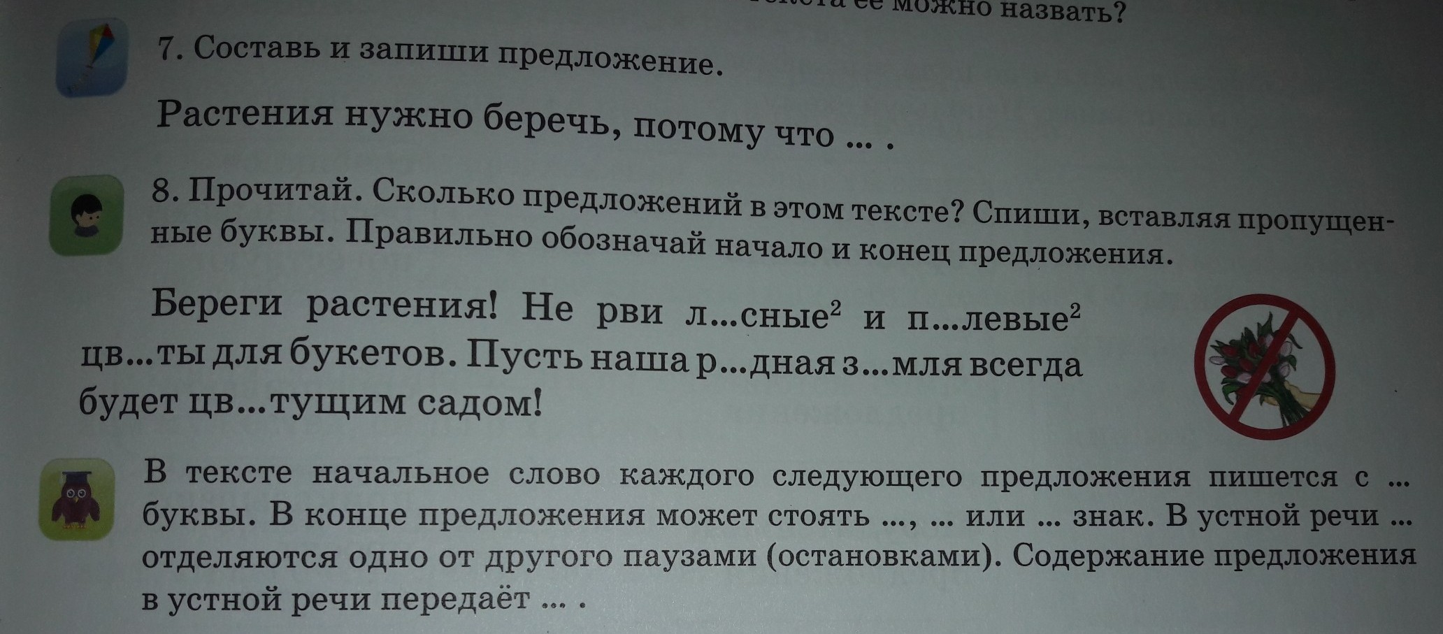 7) Надо охранять и беречь растения потому, что кислород, жизненно необходимый для людей и животных, образуется в результате фотосинтеза в растительных клетках. 8) 3 предложения. Береги растения! Не рви лесные и полевые цветы для букетов. Пусть наша родная земля всегда будет цветущим садом!