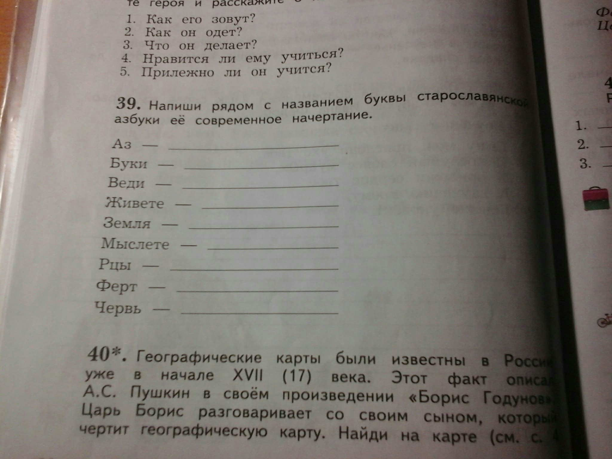 Напиши рядом с названием буквы старославянской Азбуки ее современное начертание.