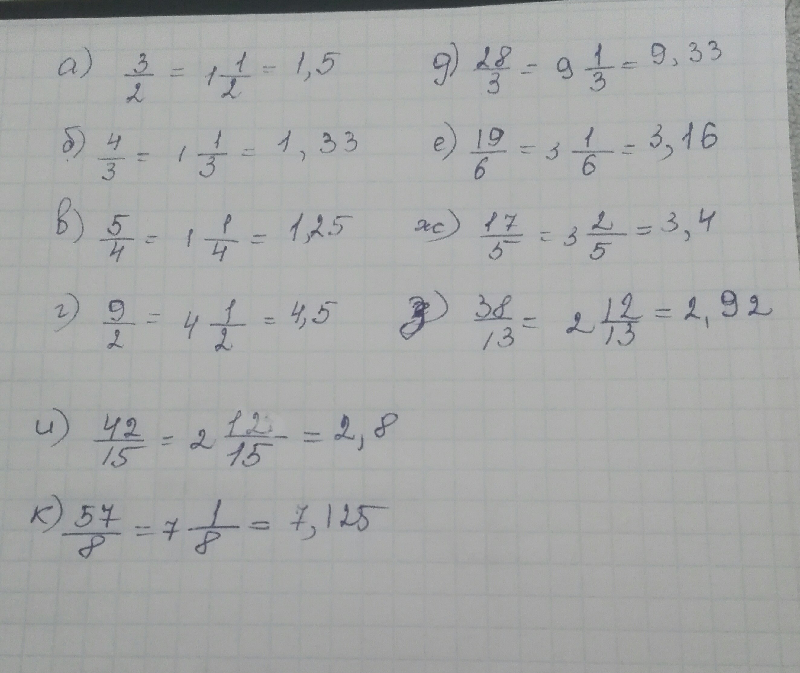Разделите с остатком числитель дроби на знаменатель и запишите результат в виде смешанной дроби а)3/2 б)4/3 в) 5/4 г) 9/2 д)28/3 е)19/6 ж017/5 з)38/13 и) 42/15 к) 57/8 (помогите пожалуйста)