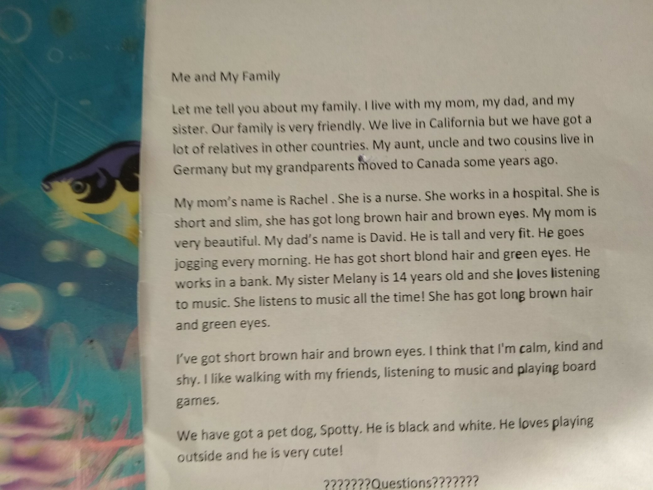 Мою маму зовут Рейчел. Она медсестра. она работает в госпитале. Она миниатюрная и стройная, у нее длинные коричневые волосы и карие глаза. моя мама очень красивая. моего папу зовут Дэвид. он высокий и подтянутый.Каждое утро он ходит на йогу. у него короткие светлые волосы и зелёные глаза. Он работает в банке. Моей сестре Мелани 14 лет, и она любит слушать музыку. Она слушает музыку постоянно! У нее длинные коричневые волосы и зелёные глаза.