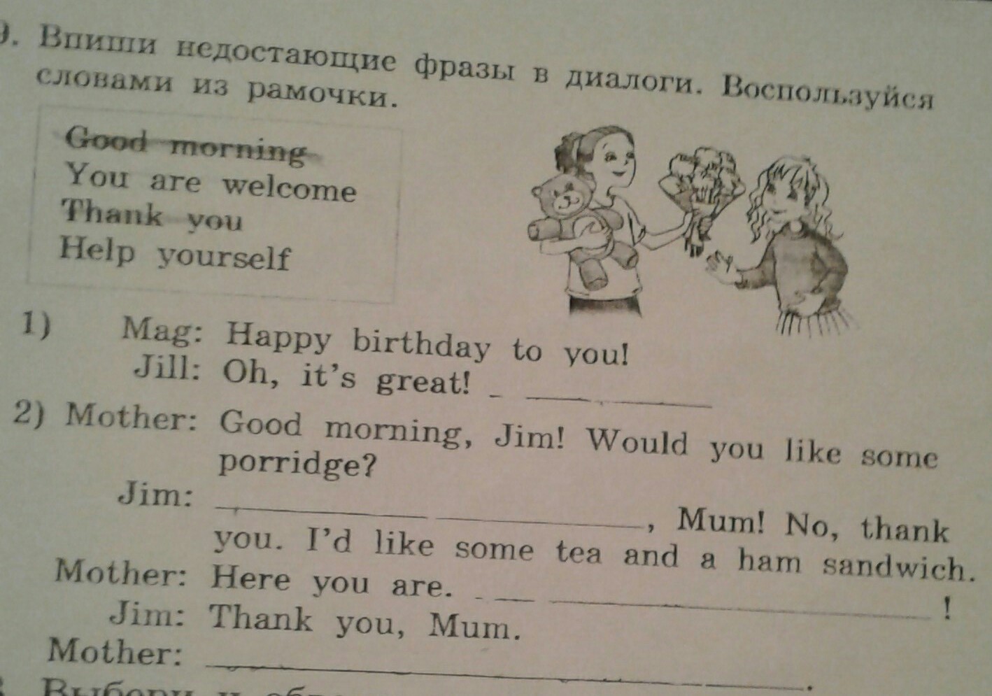 В первое предложение Thank you. Во второе good morning. В третье you are welcome, и в последнее help yourself