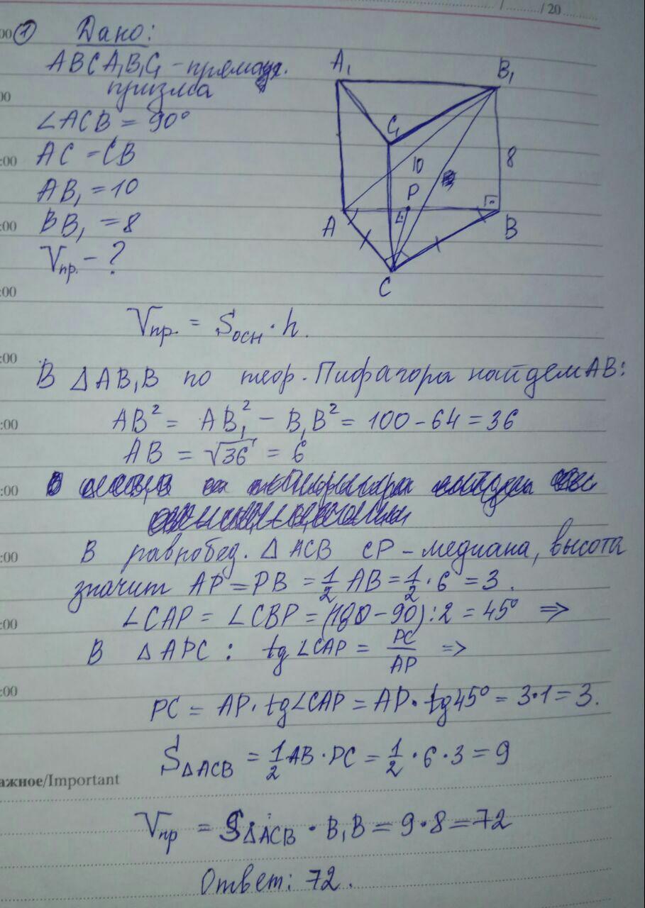 Задача 1. Объем призмы равен 72. Решение на фото.)