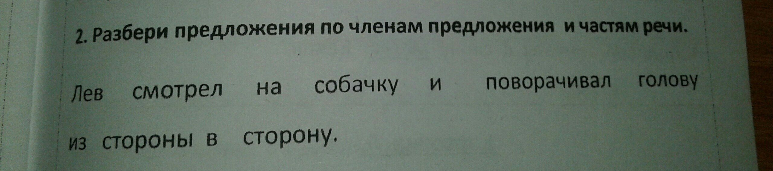 Лев (подлежащие,существительное) смотрел (сказуемое,глагол) на собачку (дополнение,существительное) и поворачивал (сказуемое,глагол) голову (дополнение,существительное) из стороны (дополнение,существительное) в сторону (дополнение,существительное) .