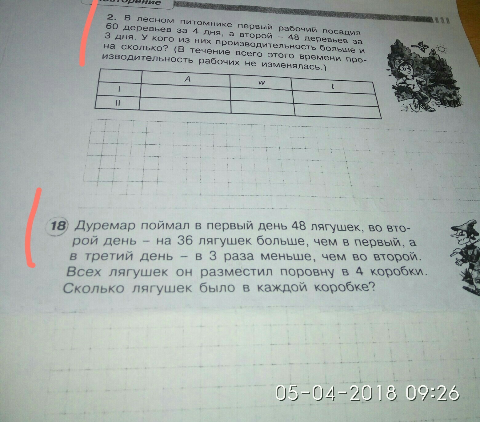 160:4=40 лягушек в каждой коробке №2 60:4=15 деревьев в день первый рабочий 48:3=16 деревьев в день второй рабочий 16-15=1 на столько быстрее работал 2 работник