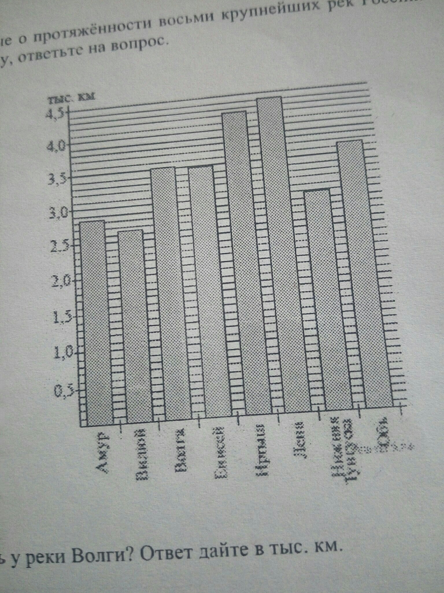 на диаграмме приведены данные о протяженности восьми крупнейших рек России. Первое место по протяженности занимает Лена. Используя диаграмму ответьте на вопрос. Какая примерно протяженность у реки Волги? ответ дайте в тыс. км.