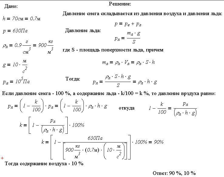 На земле лежит слой снега толщиной h = 70 см.Давление снега на землю (без учета атмосферного давления) равно p = 630 Па.Погода морозная, и снег состоит из воздуха и льда.Определите, сколько процентов объема снега занимает лёд, а сколько процентов - воздух.Плотность льда равна Ρ = 0.9 г/см3. Ускорение свободного падения считать равным g = = 10 м/c^{2}