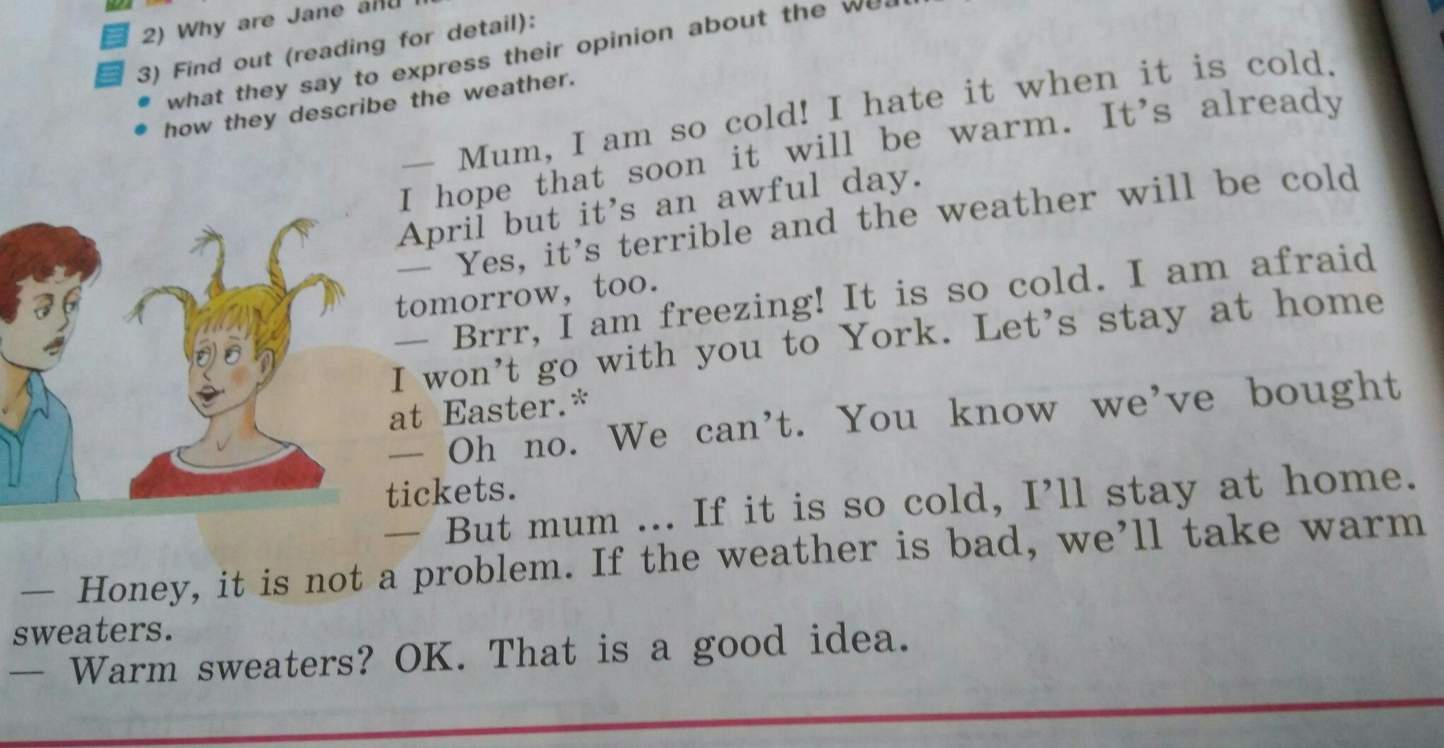 Мам так холодно. Я ненавижу когда холодно. Я надеюсь что скоро будет тепло. Начался апрель, но это ужасный день. Да , это ужасно и погадать завтра тоже будет холодной. Бор я замёрзл(а). Так холодно. Я боюсь что не поеду с тобой в (Нью) Йорк. Давай останемся дома на Пасху. О нет. Мы не сможем. Вы знаете что мы купили билеты.но мама... если так холодно мы можем остаться дома.  Мёд, это не проблема.