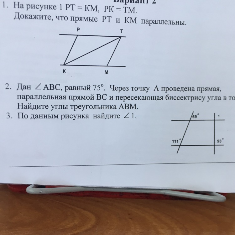 ты.к. углы равны 111 и 69 (в сумме 180) (угол рядом с 69 равен 111 (180-69=111)) как соответственные , то прямые параллельны , следует угол 1 равен 87 , т.к. 180-93=87