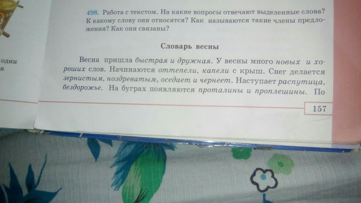 быстрая и дружная(какая);новых и хороших(каких);оттепели,капели(что);зернистым,ноздреватым(каким),оседает и чернеет(что делает);распутница,бездорожье(что);проталины и проплешины(что)