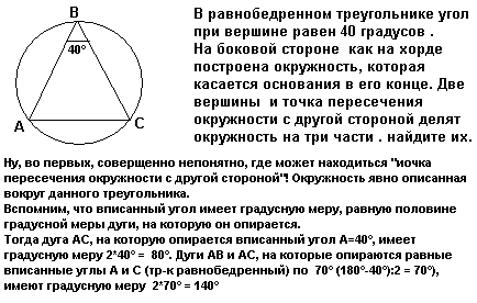 в равнобедренном треугольнике угол при вершине равен 40 градусов . На боковой стороне как на хорде построена окружность которая касается основания в его конце.. Две вершины и точка пересечения окружности с другой стороны делят окружность на три части . найдите их